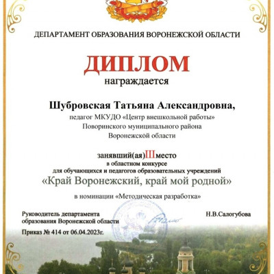 Педагог дополнительного образования Шубровская Татьяна Александровна заняла 3-е место, в номинации "Методическая разработка" Поздравляем!!!!!