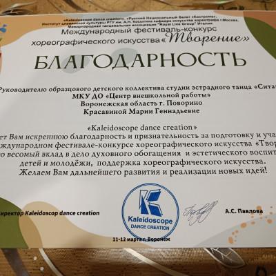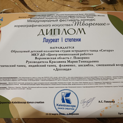 Образцовый коллектив студии эстрадного танца "Ситара", под руководством Красавиной Марии Геннадьевны, с индийским танцем "Дхолида" стал Лауреатом I степени, а с танцем "За рекой" Лауреатом II степени.