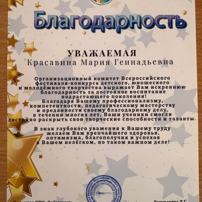 Руководитель студии эстрадного танца М.Г. Красавина за компетентность и педагогическое мастерство была удостоена Благодарности от жюри и организаторов данного конкурса!