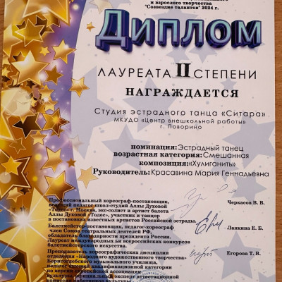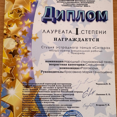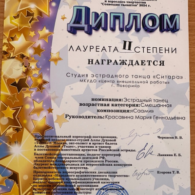 Девочки достойно выступили и с композицией "Разговоры"стали лауреатом I степени в номинации «Народный стилизованный танец», с композицией "Саами"лауреатом II степени, в номинации «Эстрадный танец», с композицией "Хулиганить" лауреатом II степени, в номинации «Эстрадный танец»