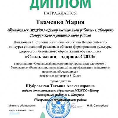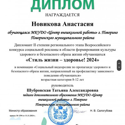 Завершился региональный этап Всероссийского конкурса социальной рекламы в области формирования культуры здорового и безопасного образа жизни обучающихся «Стиль жизни-здоровье! 2024» Номинация: "Социальный видеоролик по пропаганде здорового и безопасного образа жизни, направленный на профилактику зависимого поведения обучающихся 8-12 лет. У нас 2-е место, УРА!!!!! Так держать!!!!!