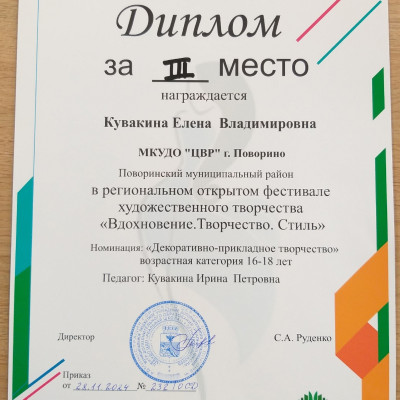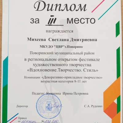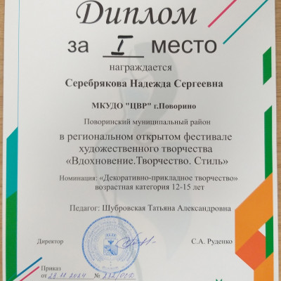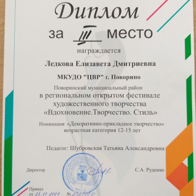 МКУДО "ЦВР"г.Поворино принял активное участие в данном фестивале. На отборочный заочный этап было отправлено 11 заявок от объединений "Очумелые ручки"(пдо Кувакина И.П.), "Рукодельница " (пдо Шубровская Т.А. ) и "Мир творчества " (пдо Новикова Н.В.). На очный этап были приглашены пять наших участниц, которые заняли призовые места и были награждены дипломами. Поздравляем девочек с победой и желаем дальнейших творческих успехов!!!