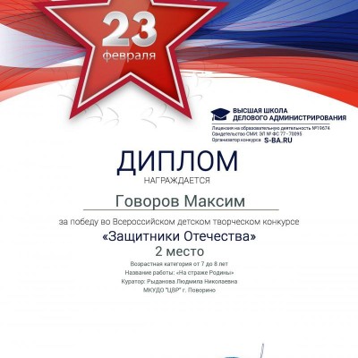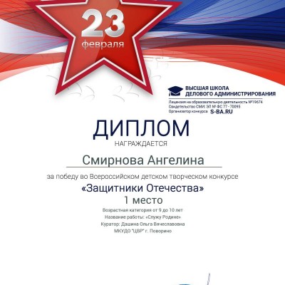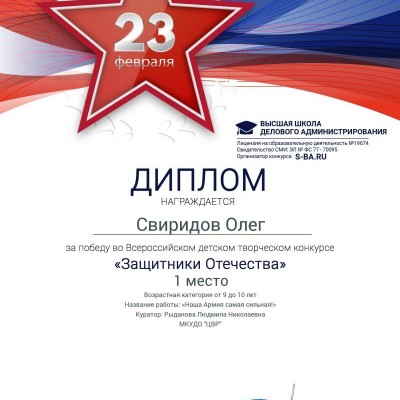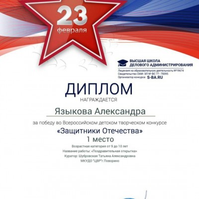 День защитника Отечества служит главным образом символом памяти и уважения истории России, героев, которые имели мужество встать на защиту своей Родины. Обучающиеся Центра внешкольной работы приняли участие во Всероссийском  творческом конкурсе "Защитники Отечества", Поздравляем ребят с дипломами за 1 и 2 места. Так держать!